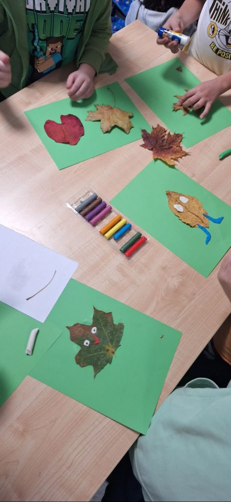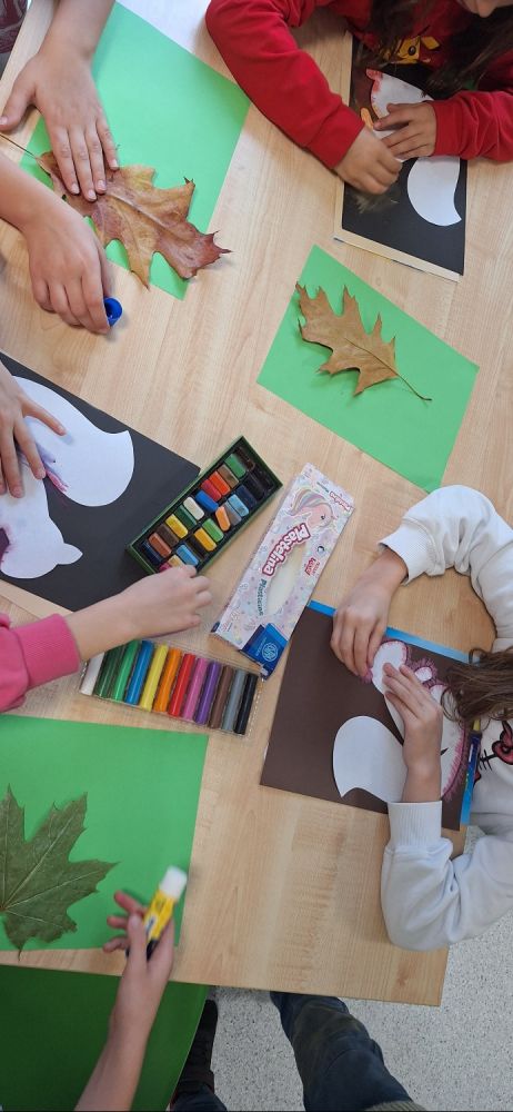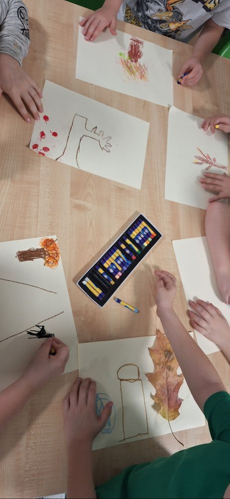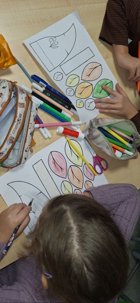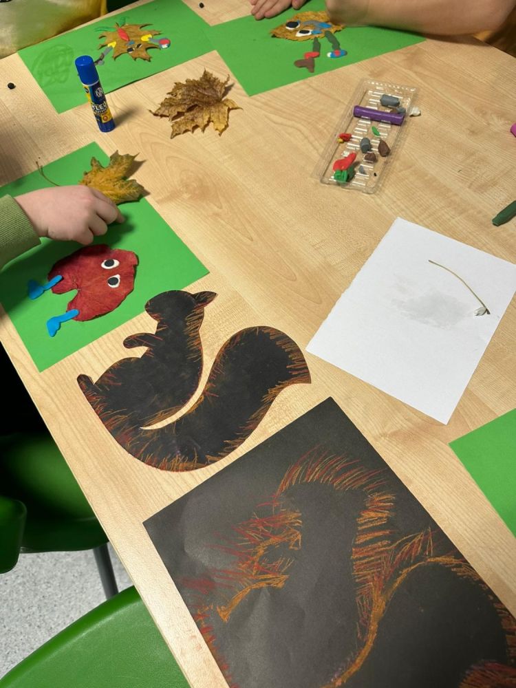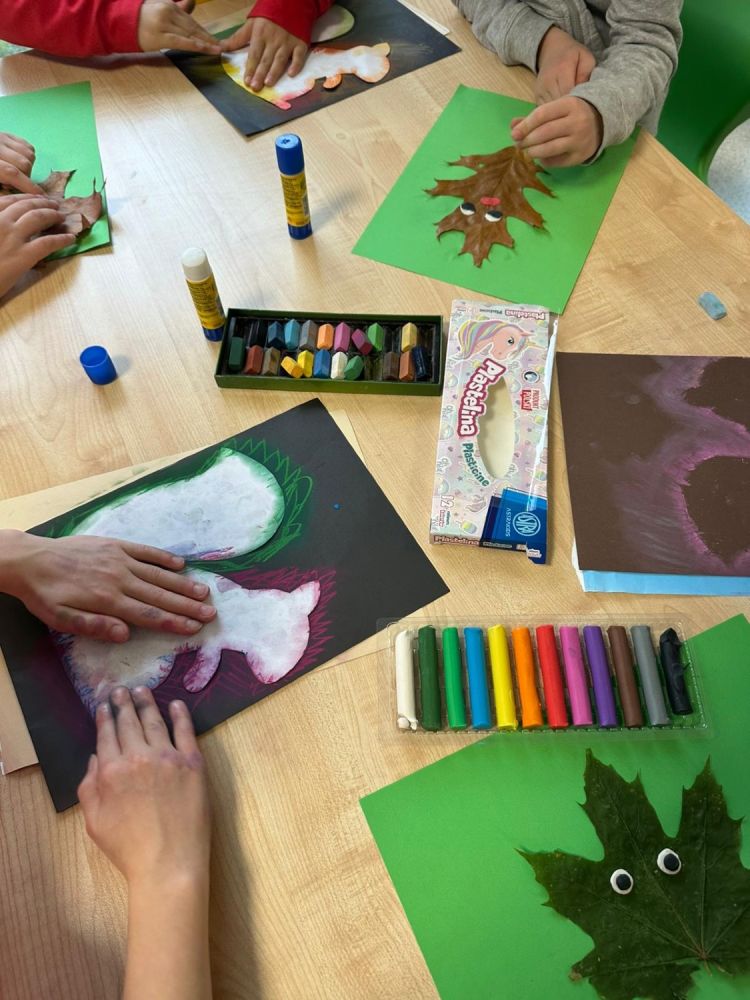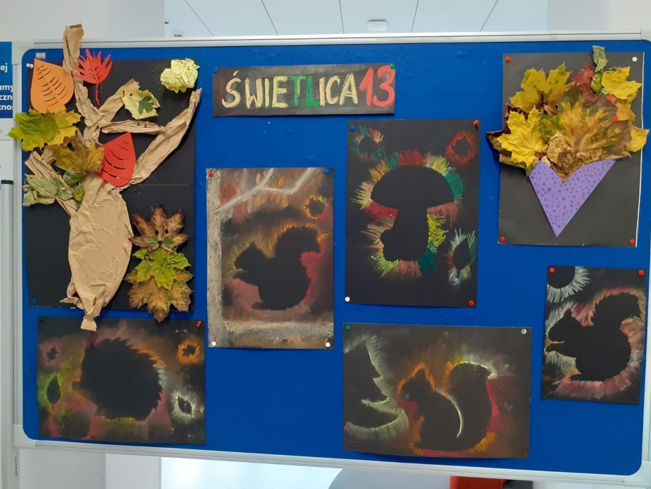 Jesienna sceneria w świetlicy ożyła dzięki dziecięcym pomysłom. Liście wykonane techniką zentangle, wiewiórki i jeże tworzą wyjątkową, ciepłą galerię prac dzieci z klas 1a, 1c i 2b.
