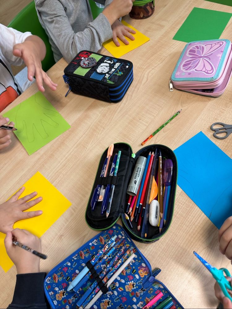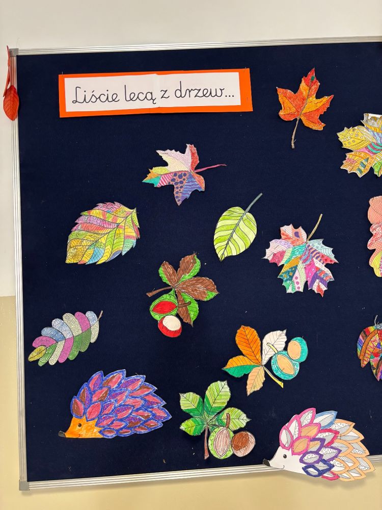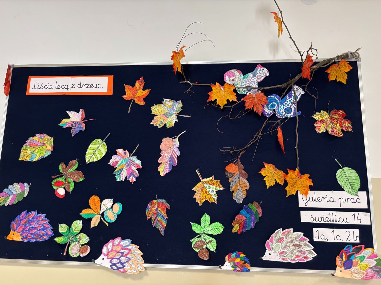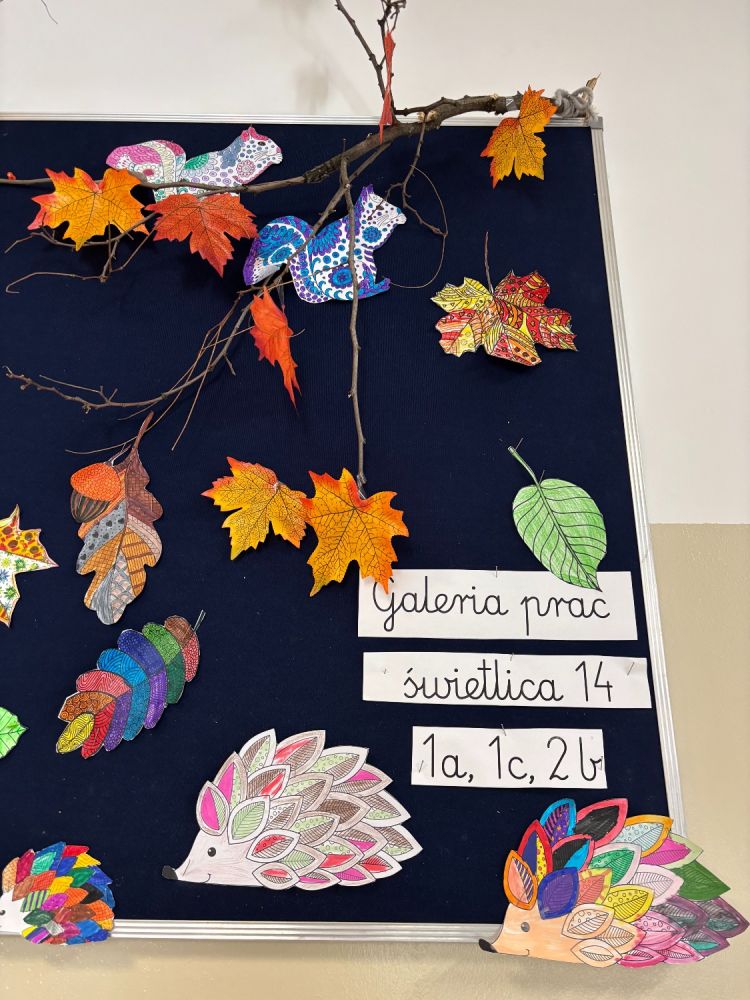 Jesienna sceneria w świetlicy ożyła dzięki dziecięcym pomysłom. Liście wykonane techniką zentangle, wiewiórki i jeże tworzą wyjątkową, ciepłą galerię prac dzieci z klas 1a, 1c i 2b.