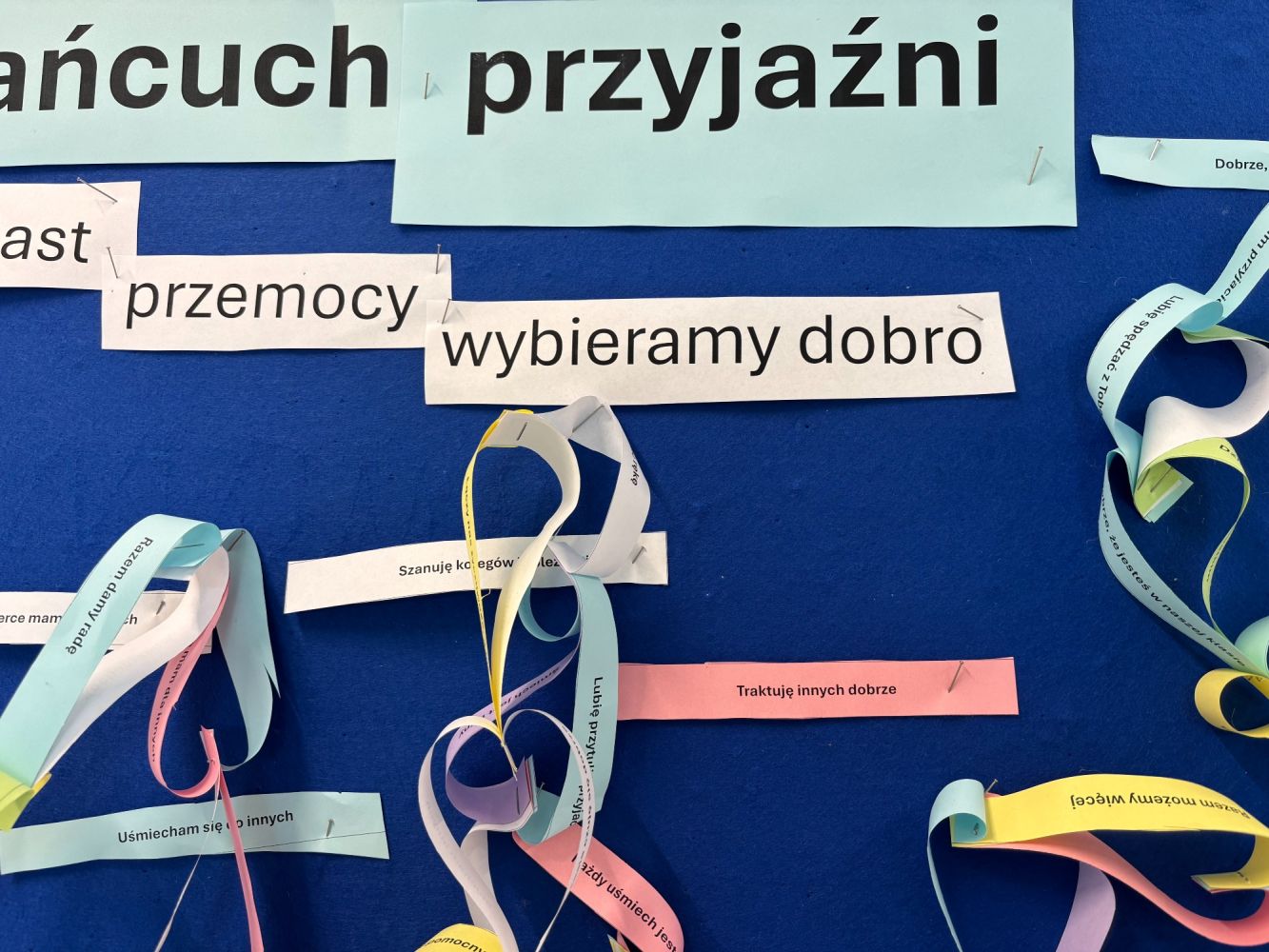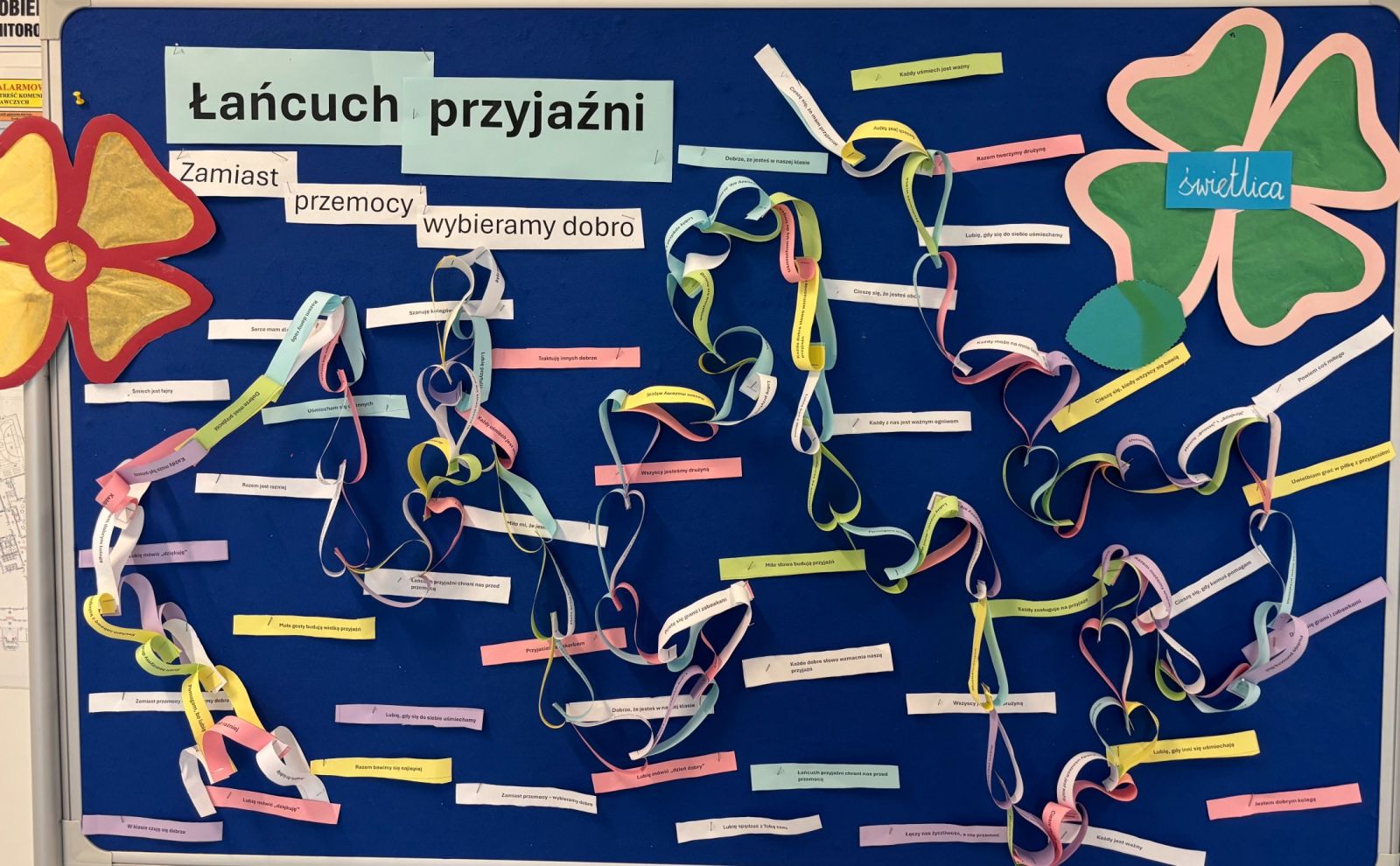 Z okazji Tygodnia Przeciwdziałania Przemocy stworzyliśmy Łańcuch Przyjaźni! Każde ogniwo to dobre słowo lub miły gest, który pokazuje, że w naszej świetlicy pomagamy sobie, szanujemy innych i wspólnie tworzymy przyjazną atmosferę.
